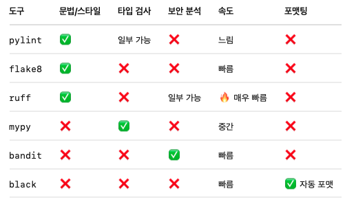 - flake8, black 등 기존 라이브러리들의 규칙들을 대부분 지원해서 ruff 하나만 있어도 프로젝트 관리하는데 문제가 없음